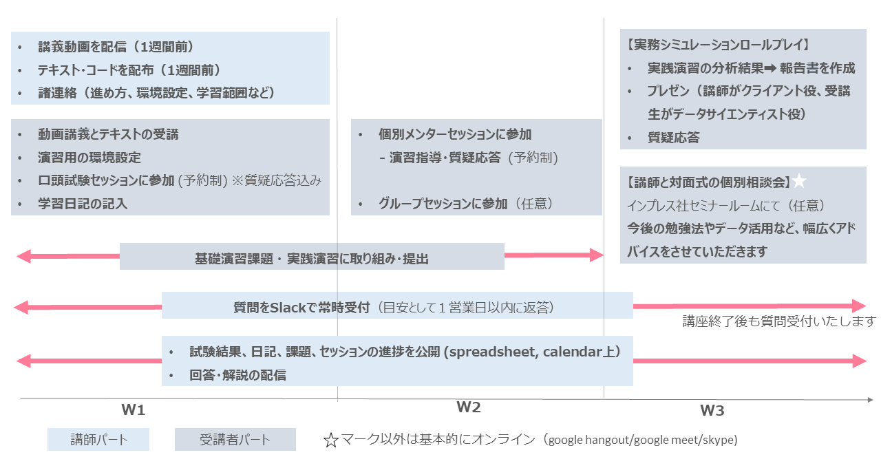 本講座は、新しい形の完全オンライン形式のデータサイエンストレーニングとして開催いたします。場所・時間に縛られないと同時に、一般のオンライン講座の弱点を今までにない圧倒的な強⼒ファシリテーションでカバーし、「本当に使える」ための訓練をマンツーマン形式で実施します。